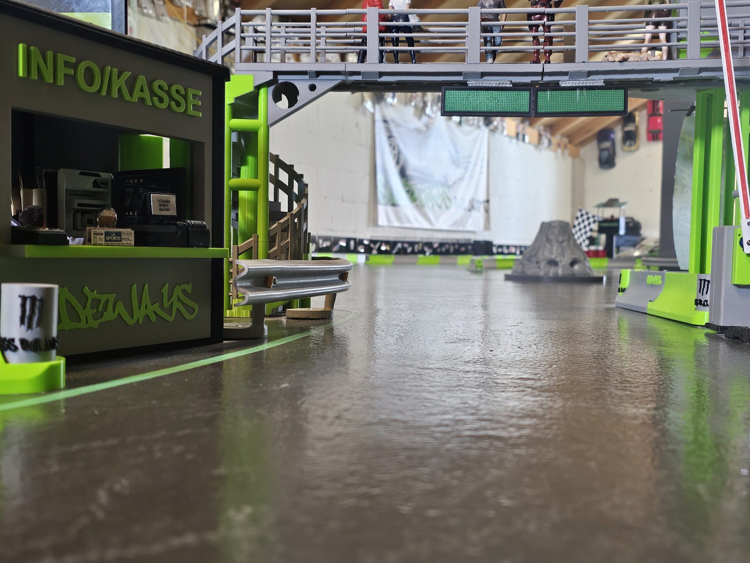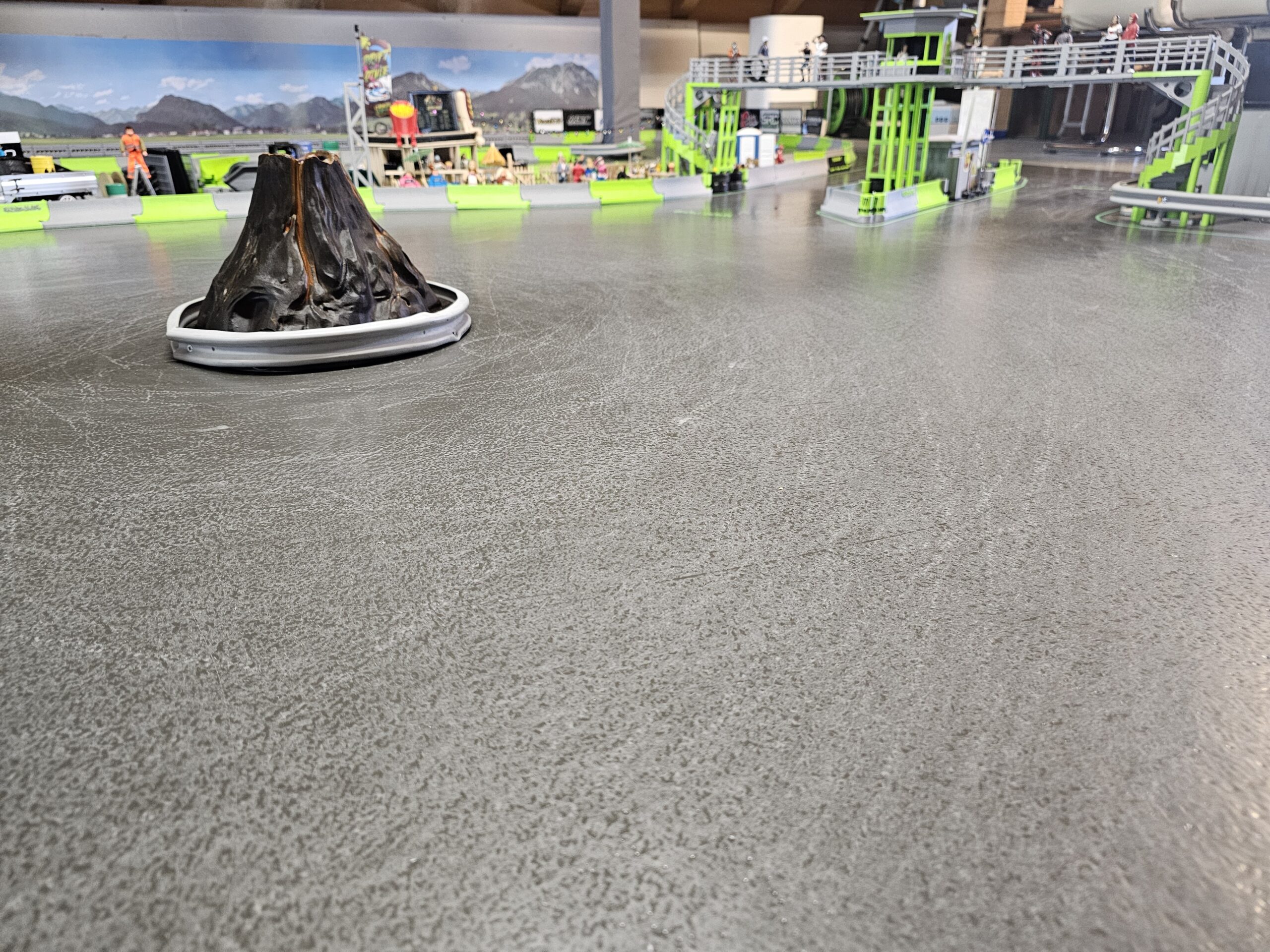 Zu sehen sind Fahrbahn, Streckenbegrenzungen, Zuschauerbrücke, Infokasse und realistische Dekorationen – vom Mini-Vulkan bis zu ausgestellten Fahrzeugen an der Wand.