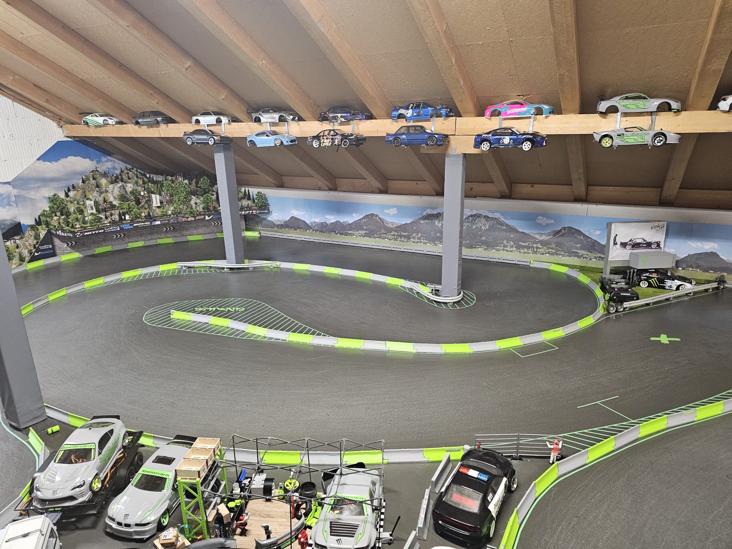 Unter dem Dach sind zahlreiche RC Drift Autos ausgestellt – ein Highlight für Fans der Schweizer Drift-Community.