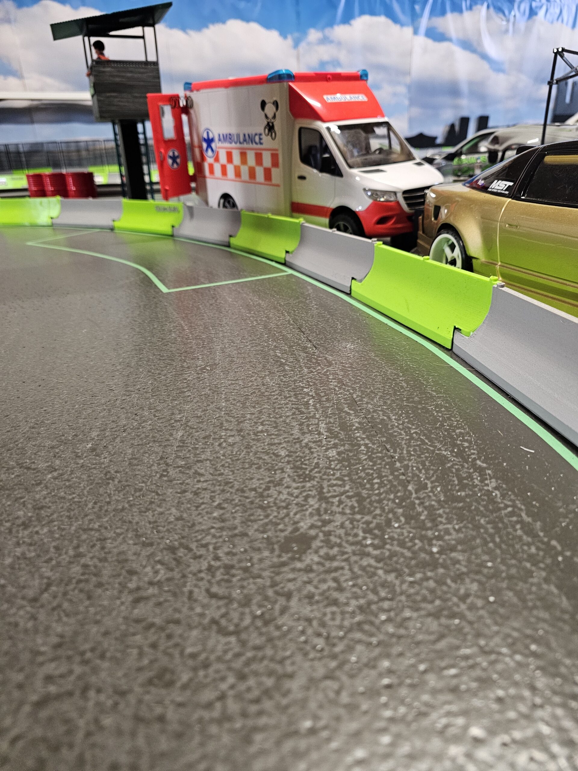 Realistische Szene mit Ambulanzfahrzeug und Streckenturm auf der Sideways RC Drift Anlage