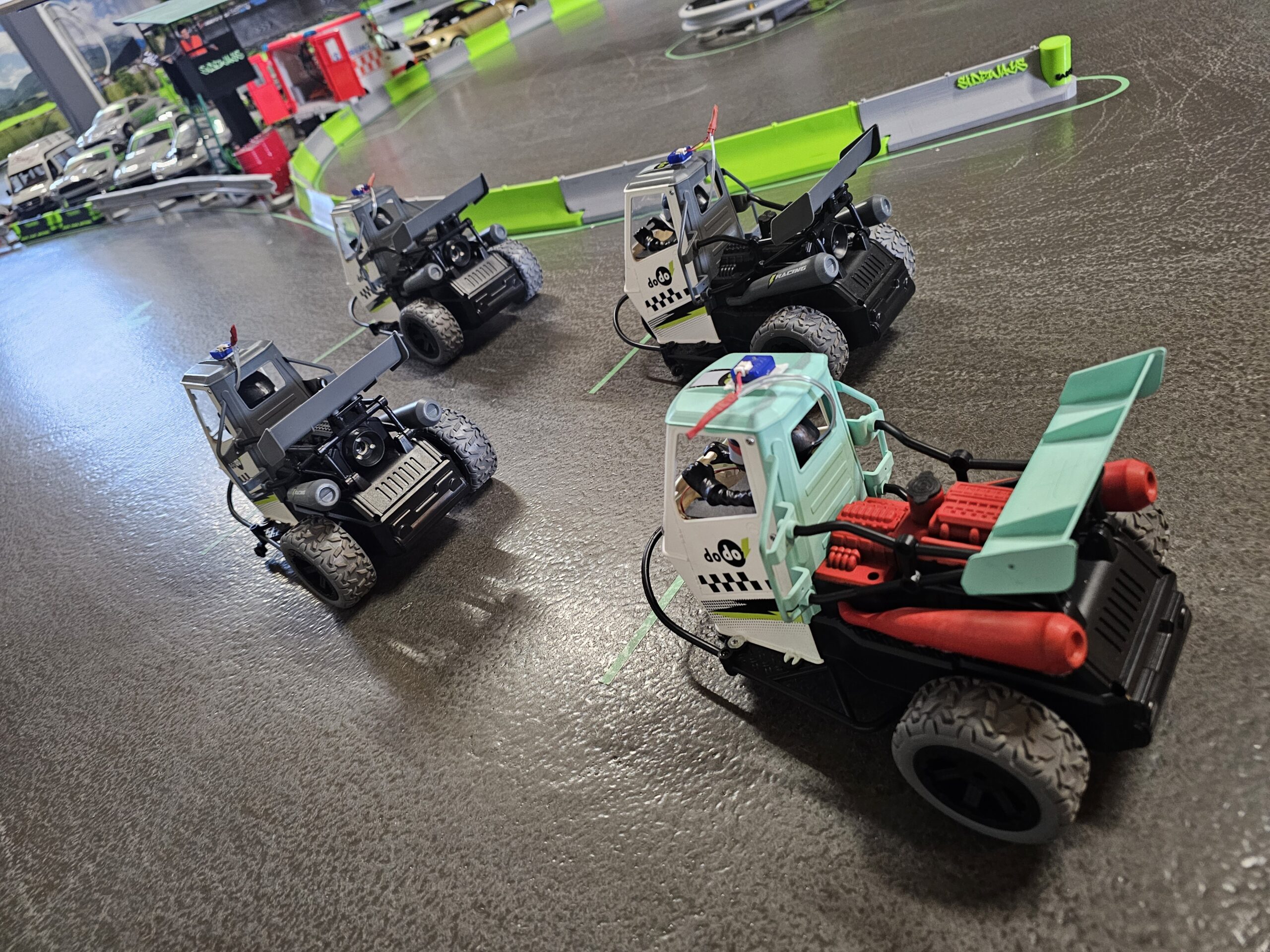 Wir haben ein Zeitmesssystem installiert und können so kleine Rennen fahren, die Rundenzeiten werden über ein Monitor übertragen.